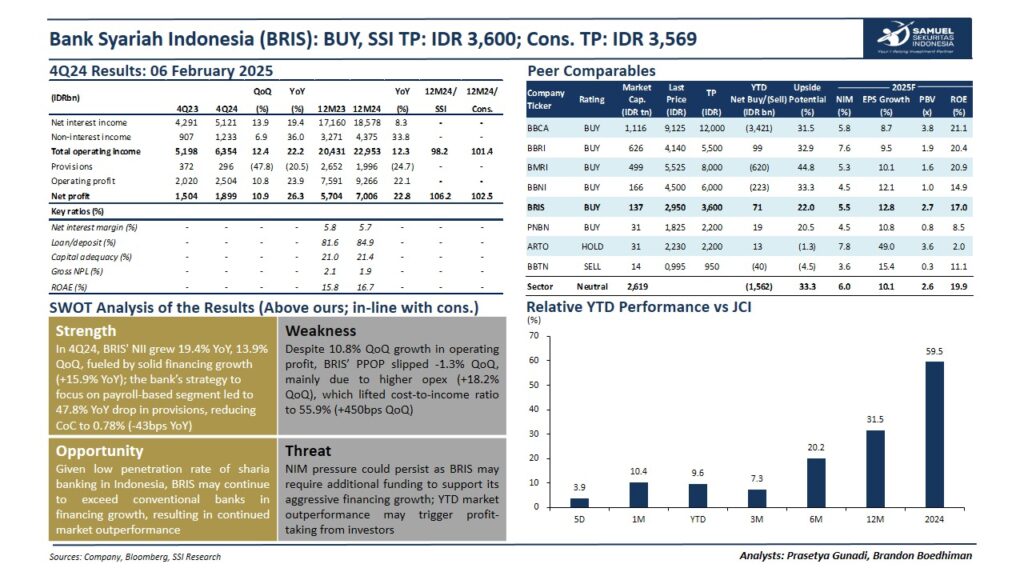 Pada kuartal keempat 2024, BRIS mencatat pertumbuhan pendapatan bunga bersih yang cukup signifikan, naik hampir 19,4% dibanding tahun sebelumnya dan 13,9% dibanding kuartal sebelumnya. Peningkatan ini didorong oleh pertumbuhan pembiayaan yang solid sekitar 15,9% secara tahunan. Selain itu, strategi BRIS yang fokus pada segmen berbasis gaji terbukti efektif dalam menekan biaya provisi hingga turun hampir setengahnya dibanding tahun lalu. Akibatnya, biaya kredit (Cost of Credit/CoC) juga turun menjadi 0,78%, atau lebih rendah sekitar 43 basis poin dari sebelumnya.