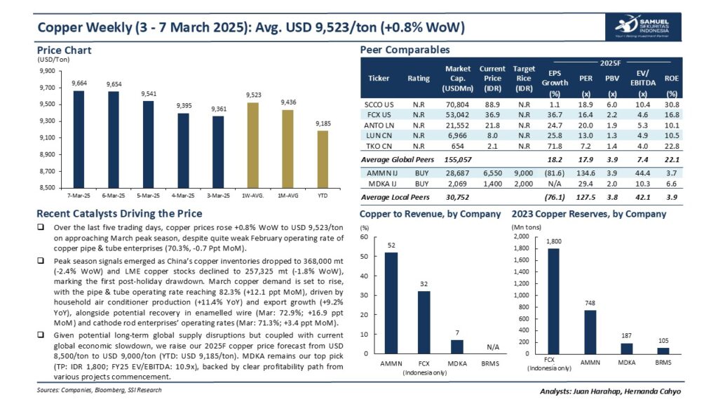 Melihat adanya potensi gangguan pasokan tembaga secara global dalam jangka panjang serta perlambatan ekonomi dunia saat ini, kami memperkirakan harga tembaga pada 2025 akan berada di kisaran USD 8.500 hingga USD 9.000 per ton. Dalam kondisi ini, MDKA tetap menjadi pilihan utama kami dengan target harga saham di IDR 1.800, didukung oleh proyeksi profitabilitas yang jelas dari berbagai proyek yang akan segera berjalan.