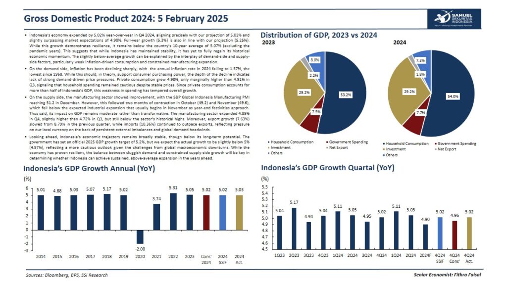 Perekonomian Indonesia tumbuh sebesar 5,02% year-over-year (YoY) pada Q4 2024, sesuai dengan proyeksi kami sebesar 5,02% dan sedikit melampaui ekspektasi pasar sebesar 4,98%. Pertumbuhan ekonomi sepanjang tahun 2024 mencapai 5,3%, juga sejalan dengan proyeksi kami sebesar 5,25%. Meskipun pertumbuhan ini cukup baik, angkanya masih berada di bawah pertumbuhan rata-rata 10 tahun Indonesia sebesar 5,07% (tidak termasuk tahun-tahun pandemi). Hal ini menunjukkan bahwa meskipun Indonesia telah mencapai stabilitas, pemulihan ke tingkat historis masih belum terjadi. Pertumbuhan yang sedikit lebih rendah dari rata-rata ini disebabkan oleh kombinasi faktor permintaan dan pasokan, khususnya lemahnya konsumsi yang dipengaruhi inflasi dan masih terbatasnya ekspansi sektor manufaktur.