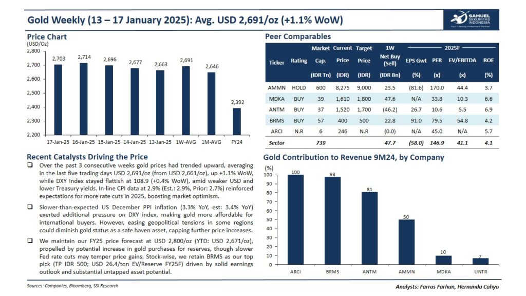 Kami tetap memperkirakan harga emas akan berada di kisaran USD 2.800 per ons hingga akhir tahun 2025, didorong oleh potensi peningkatan permintaan emas sebagai cadangan. Namun, jika The Fed memperlambat laju pemotongan suku bunga, hal ini bisa menahan kenaikan harga emas. Dari sisi saham, kami masih memilih BRMS sebagai rekomendasi utama, dengan target harga IDR 500 per saham, karena prospek pendapatannya yang kuat dan potensi pengembangan asetnya.