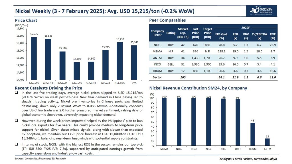 Dalam lima hari terakhir, harga rata-rata nikel turun tipis menjadi 15.215 dolar per ton, turun sekitar 0,18% dibandingkan minggu sebelumnya. Penurunan ini terjadi akibat permintaan yang masih lesu setelah perayaan Tahun Baru Imlek di China, yang berdampak pada aktivitas perdagangan yang melambat. Stok nikel di pelabuhan China juga hanya turun sedikit, sekitar 2 juta metrik ton, menjadi 8,086 juta metrik ton. Selain itu, kekhawatiran terhadap potensi perang dagang antara Amerika Serikat dan China semakin menekan sentimen pasar dan meningkatkan risiko perlambatan ekonomi global, yang berdampak negatif pada permintaan nikel.