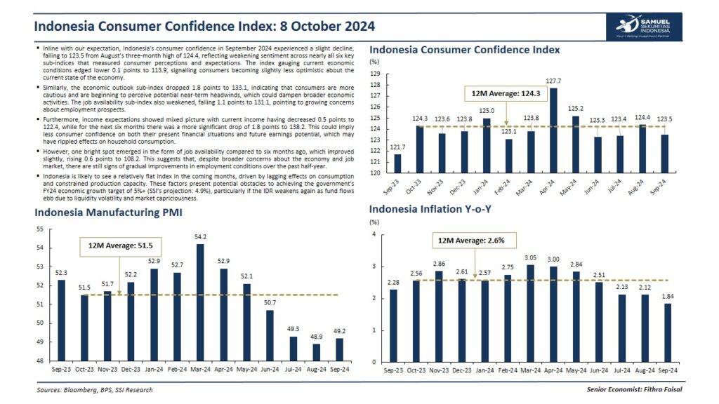 Indeks kepercayaan konsumen Indonesia turun tipis ke 123,5 di bulan September 2024, dari posisi Agustus di 124,4 yang juga merupakan titik tertinggi dalam tiga bulan terakhir. Hampir seluruh sub-indeks utama yang mengukur persepsi dan ekspektasi konsumen melemah. Sub-indeks kondisi ekonomi saat ini turun 0,1 poin menjadi 113,9, yang menunjukkan bahwa konsumen kehilangan sedikit optimisme mengenai keadaan ekonomi saat ini.