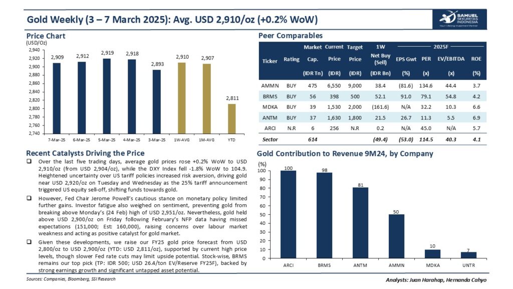 Melihat perkembangan ini, proyeksi harga emas untuk tahun 2025 yang sebelumnya diperkirakan berada di USD 2.800 per ons kini direvisi naik menjadi USD 2.900 per ons, dengan rata-rata harga emas sepanjang tahun ini berada di USD 2.811 per ons. Harga emas saat ini yang masih cukup tinggi menjadi faktor pendukung utama revisi tersebut, meski ruang kenaikan emas ke depan mungkin lebih terbatas karena ekspektasi penurunan suku bunga The Fed yang lebih lambat. Terkait pilihan saham, BRMS tetap menjadi pilihan utama dengan target harga Rp500 per lembar, didukung oleh potensi cadangan yang masih besar dan pertumbuhan laba yang kuat.