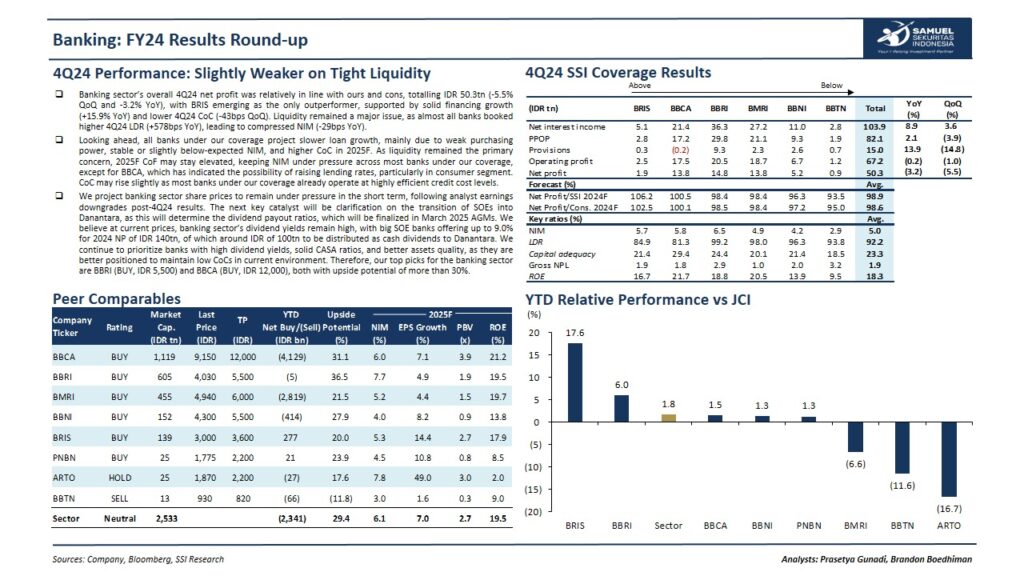 Sepanjang kuartal keempat 2024, sektor perbankan mencatatkan laba bersih sebesar Rp50,3 triliun, turun sekitar 5,5% dibanding kuartal sebelumnya dan turun 3,2% secara tahunan. BRIS menjadi bank dengan kinerja terbaik, ditopang oleh pertumbuhan kredit yang kuat, naik hampir 16% dibanding tahun sebelumnya, serta biaya kredit yang lebih rendah. Namun, secara keseluruhan, likuiditas masih menjadi tantangan besar rasio pinjaman terhadap simpanan (LDR) naik cukup signifikan, yang pada akhirnya menyebabkan biaya kredit ikut naik.