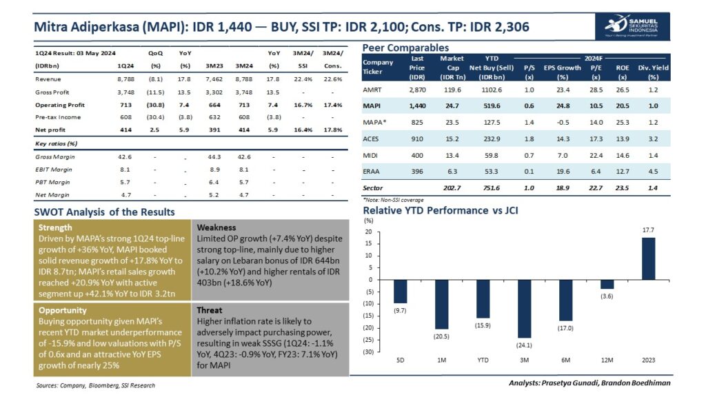 MAPI merasakan dampak positif dari periode Lebaran yang jatuh pada 10-11 April tahun ini. Selama kuartal ini, MAP melanjutkan ekspansi gerai fisiknya di Indonesia dan regional. Perusahaan terus mengembangkan gerai digital dengan mengoperasikan 49 kanal online per akhir Maret 2024, dan melakukan kolaborasi dengan beberapa online marketplace pihak ketiga.