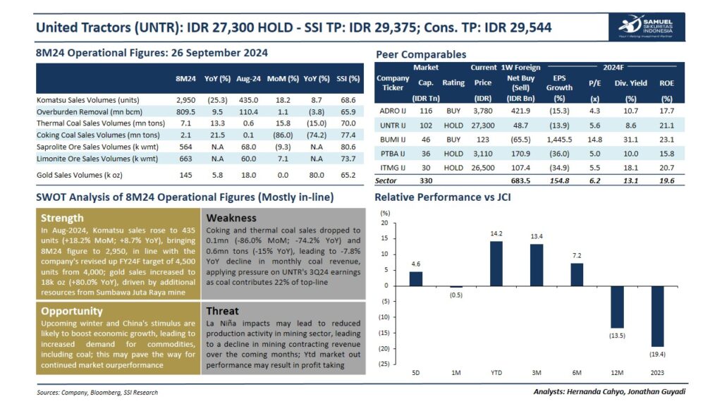 Pada Agustus 2024, penjualan Komatsu meningkat signifikan menjadi 435 unit, naik 18,2% dibandingkan bulan sebelumnya dan 8,7% dibandingkan tahun sebelumnya, sehingga total penjualan selama 8 bulan pertama 2024 mencapai 2.950 unit. Hal ini sejalan dengan target perusahaan yang telah direvisi untuk tahun 2024, yakni 4.500 unit dari sebelumnya 4.000 unit. Selain itu, penjualan emas UNTR juga mengalami kenaikan menjadi 18.000 ons, atau naik 80% dibandingkan tahun lalu, didorong oleh sumber tambahan dari tambang Sumbawa Juta Raya.