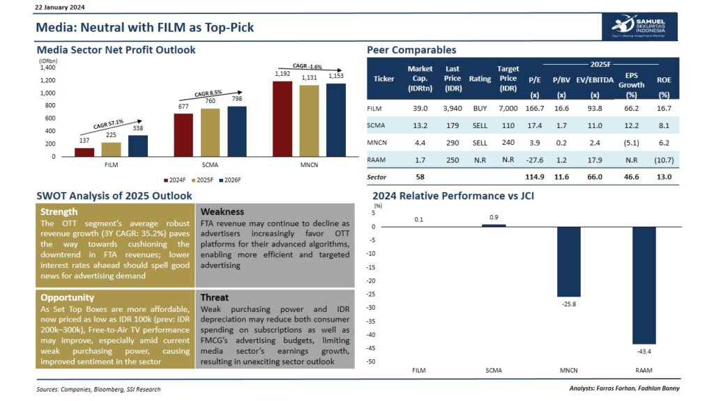 Sektor media memiliki sejumlah faktor yang dapat menjadi penopang pertumbuhannya di masa depan, salah satunya adalah pertumbuhan pesat di segmen OTT, yang mencatat pertumbuhan pendapatan rata-rata 35,2% dalam tiga tahun terakhir. Pertumbuhan ini membantu mengimbangi penurunan pendapatan di segmen Free-to-Air (FTA) yang tengah tertekan Selain itu, tingkat suku bunga yang diperkirakan akan lebih rendah ke depan juga memberikan peluang positif untuk meningkatkan permintaan iklan.