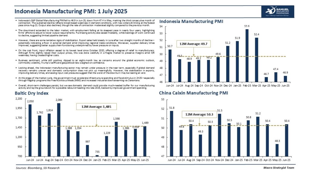 Indeks PMI Manufaktur S&P Global Indonesia turun menjadi 46,9 pada Juni 2025, lebih rendah dari 47,4 pada bulan sebelumnya. Ini menjadi bulan ketiga berturut-turut sektor manufaktur mengalami kontraksi, mencerminkan melemahnya permintaan secara luas. Penurunan ini terutama disebabkan oleh menyusutnya pesanan baru yang terjadi pada laju tercepat sejak Agustus 2021, sementara output juga menurun, meski kontraksinya sedikit lebih moderat dibandingkan bulan sebelumnya.