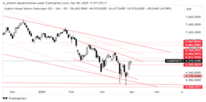 Indeks sempat bentuk pola double bottom yang bullish. Namun masih dalam downchannel dan di dekat resistance kuat pola down channel (Feb-Apr25). Jika tertekan di bawah 6420, maka pola ini kembali dalam pola sebelumnya yang cenderung sideways di kisaran 5938-6566.