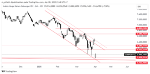 Indeks turun dengan gap dan sempat mengalami halt, lalu rebound saat dekati support kuat (Jan2018-Apr2025). Pola gap ini cenderung sebagai common gap, yang cenderung tertutupi dengan cepat. Sekurang-kurangnya separuh gap, di sekitar 6192-6280. Namun, masih indeks masih dalam pola down channel, sehingga tekanan jual masih ada.