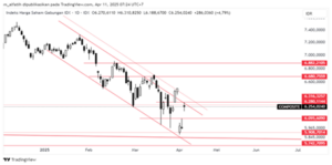 Indeks naik dengan gap dalam pola konsolidasi selama sebulan terakhir. Namun tertahan di resistance channel pola Jan-Apr25. Kemungkinan indeks akan koreksi lagi mengisi gap yang terjadi dalam kisaran 6095-6680.