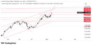 Indeks kemarin naik kencang mengakhiri konsolidasi dalam dua pekan terakhir, menjadi bullish continuation. Mungkin ada koreksi sebagai reaksi wajar setelah breaks out. Selama tidak turun dibawah 7666 maka potensi ke 7800-7920.