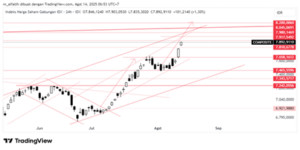 Indeks kemarin masih menguat bahkan dengan gap. Saat ini gap menjadi support kuat. Selama indeks tidak kembali kebawah gap, maka gap menjadi perhitungan 50% menuju target, disekitar 8200. Namun ada beberapa trendline kuat sebelumnya di 7980-8045-8150.