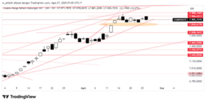 Indeks kemarin dibuka menguat mencoba menuju area tertinggi bulan ini di sekitar 7980-8045, namun kemudian mengalami tekanan jual kembali. Posisi masih di kisaran konsolidasi dengan support kuat di gap 7790.