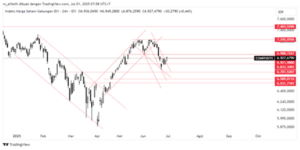 Indeks kemarin menguat dan menembus trendline penurunan sepekan terakhir. Kenaikan ini mengkonfirmasi pola falling wedge yang bullish, selama bertahan diatas 6875. Potensi kenaikan ke 7100-7240