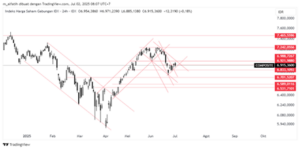 Indeks kemarin melemah di area kritis double top May-Jun25, sehingga kemungkinan akan melemah. Pelemahan cenderung ke 6830. Area resistance di 6988.