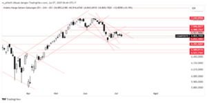 Indeks kemarin rebound dari support dalam pola konsolidasi di 6800-6990. Trend selanjutnya sangat ditentukan area mana yang ditembus. Jangka pendek ada peluang penguatan.