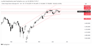 Indeks kemarin masih menolak menjadi bearish, menguat namun masih tertahan oleh trendline pola sejak Apr-Jun25 dan May-Jun25. Jika masih mampu naik diatas 7181 maka berpotensi menguji tertinggi sejak Feb25 di 7245-7295. Pelemahan dibawah 7115 mejadikan ancaman bearish double top membesar.