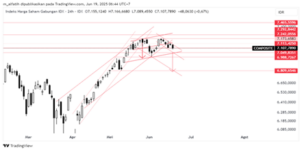 Indeks kemarin gagal tembus 7181, sehingga semakin besar kemungkinan melemah ke 7050-7000. Jika level ini tembus, maka mengkonfirmasi pola double top May-Jun25, dengan TTP ke sekitar 6800. Sentimen bearish berkurang jika mampu naik diatas 7155.