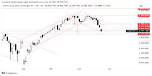 Indeks kemarin turun kencang dengan gap, yang kemudian berfungsi sebagai resistance. Meski ada rebound sifatnya jangka pendek setelah turun kencang. Next support di 6700, berikutnya yang cukup kuat di 6570.