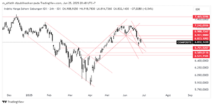 Indeks kemarin gagal melampaui 6925 sehingga melemah seperti perkiraan. Trend turun masih kuat dan kemungkinan melanjutkan pelemahan ke arah 6700, dengan batas kenaikan yang dapat mengubah trend di 6925.