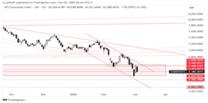 Indeks kemarin gagal menguat melampaui area resistance. Downchannel (pola sejak Jan25) masih valid, dengan area supply di sekitar 6630-6450. Sementara area support di 6265-6166 dalam jangka pendek.