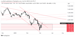 Indeks kemarin berhasil melampaui trendline pola sejak Jan25, namun terjadi intraday rejection dan volume belum meyakinkan. Keyakinan bahwa trend sudah berubah harus terlihat dari kemampuan indeks bertahan diatas 6520.