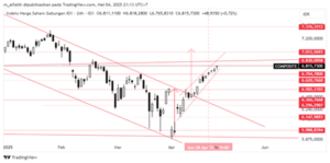 Indeks akhir pekan yang lalu masih menguat mendekati area supply 6815-6830, lalu 7012. Batas kritis saat ini di 6704.