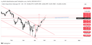 Indeks kemarin menguat, namun tertahan oleh resistance trendline pola sejak Oct2021, sehingga kemungkinan akan ada koreksi. Saat ini, support kuat ada di 6700. Sedang resistance di 6880-6953-7012.