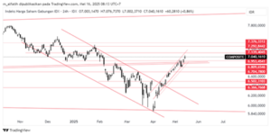 Indeks kemarin melanjutkan trend kenaikan. Hambatan di trendline pola sejak tahun 2021 hanya memberi koreksi sesaat. Saat ini 6950 menjadi support kuat. Potensi kenaikan ke 7130 dan jika berlanjut ke sekitar 7290.
