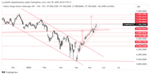 Indeks akhir pekan yang lalu masih menguat dengan momentum positif. Namun yang patut di waspadai adalah kenaikan ini dengan volume melemah. Area support kuat di 6987 (gap pekan lalu). Resistance terdekat di 7139, lalu 7300-7376-7465.