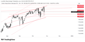 Indeks kemarin mengalami tekanan jual kuat dari trendline pola sejak Aug25 dan juga trendline sejak Jul2017. Tidak akan mudah melampaui level atas ini. Namun pola masih konsolidasi dengan demand area di 7926-8023.