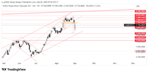 Indeks kemarin akhirnya menembus gap 12-13Aug2025. Secara TTP di 7465. Namun pola intraday, dapat menjadi pola false breaks down, dan selama bertahan diatas 7665, dan konfirmasinya jika gap 12-13Aug2025 kembali ditembus ke atas, sekitar di 7850, maka indeks akan kembali bullish.