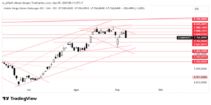 Indeks kembali mengalami tekanan jual dari supply area pola pola bulan Aug25, di 7855-8015. Mungkin ada rebound jangka pendek, namun selama belum mampu tembus diatas 7840, maka sentimen masih bearish. Support di 7735, lalu 7670.